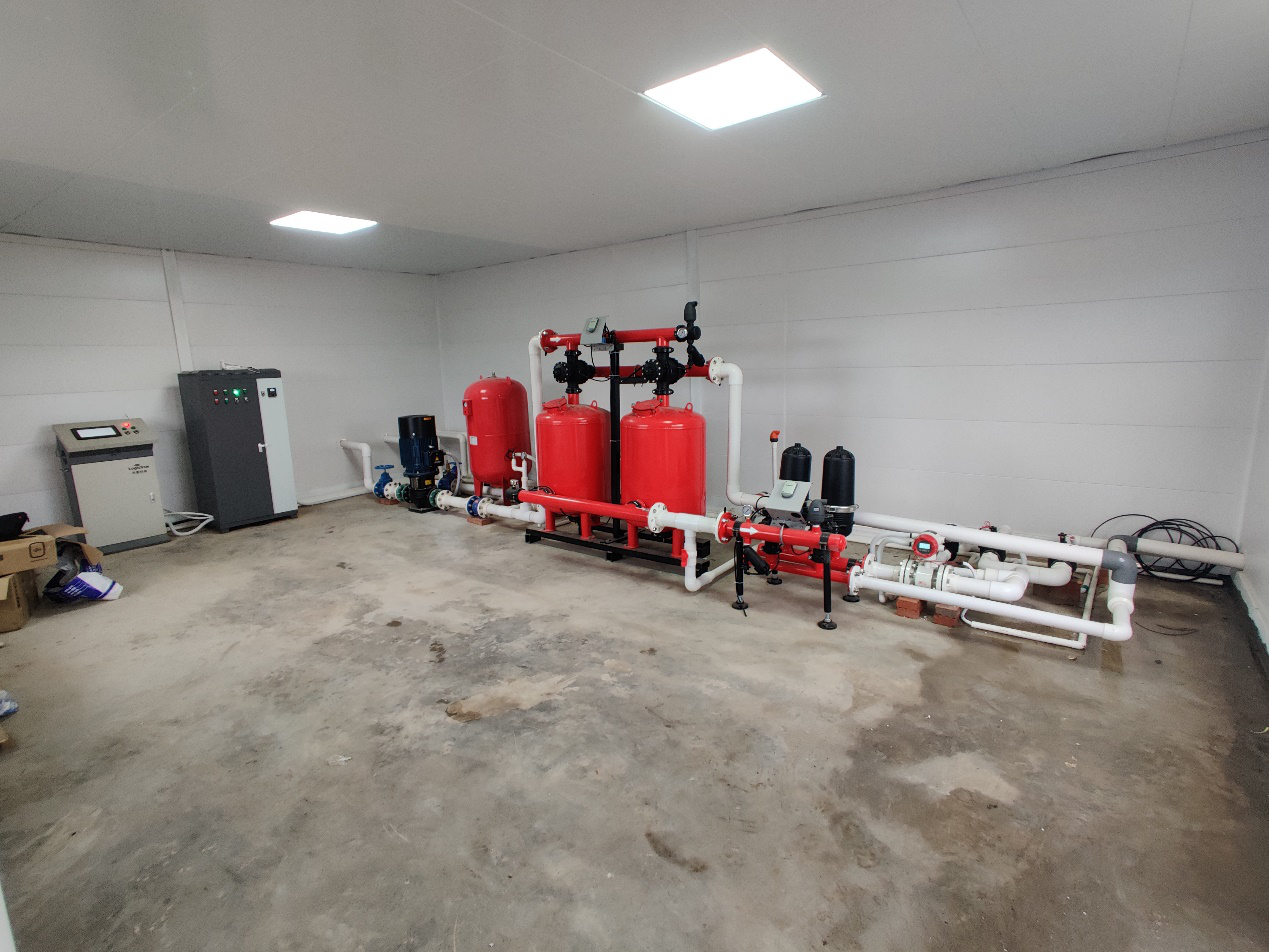 實(shí)施歷程:自2020年8月起,從第一臺(tái)設(shè)備進(jìn)場(chǎng)到機(jī)柜裝調(diào)完畢,歷時(shí)近兩個(gè)月,主要部署水肥一體化設(shè)備首部及120畝田間的滴灌及噴灌系統(tǒng),鋪設(shè)管路數(shù)千米,開(kāi)挖路面上百米。