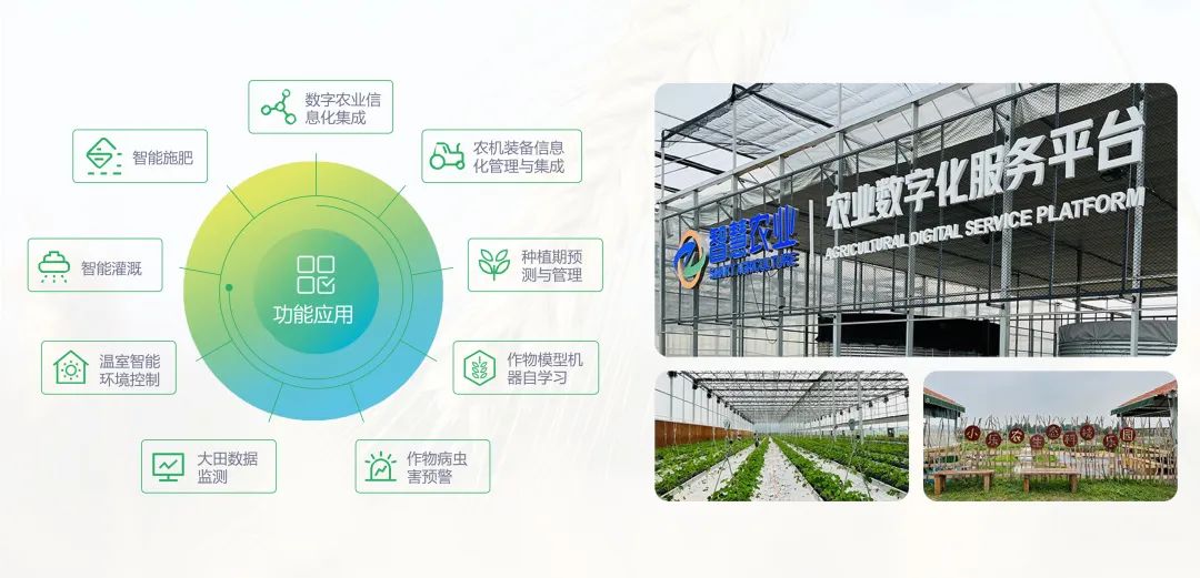 完備搭建了數字農業信息化集成、智能施肥、智能灌溉、溫室智能環境控制、大田數據監測、作物病蟲害預警、作物模型機器自學習、種植期預測與管理、農機裝備信息化管理與集成等功能場景,賦能農業生產。