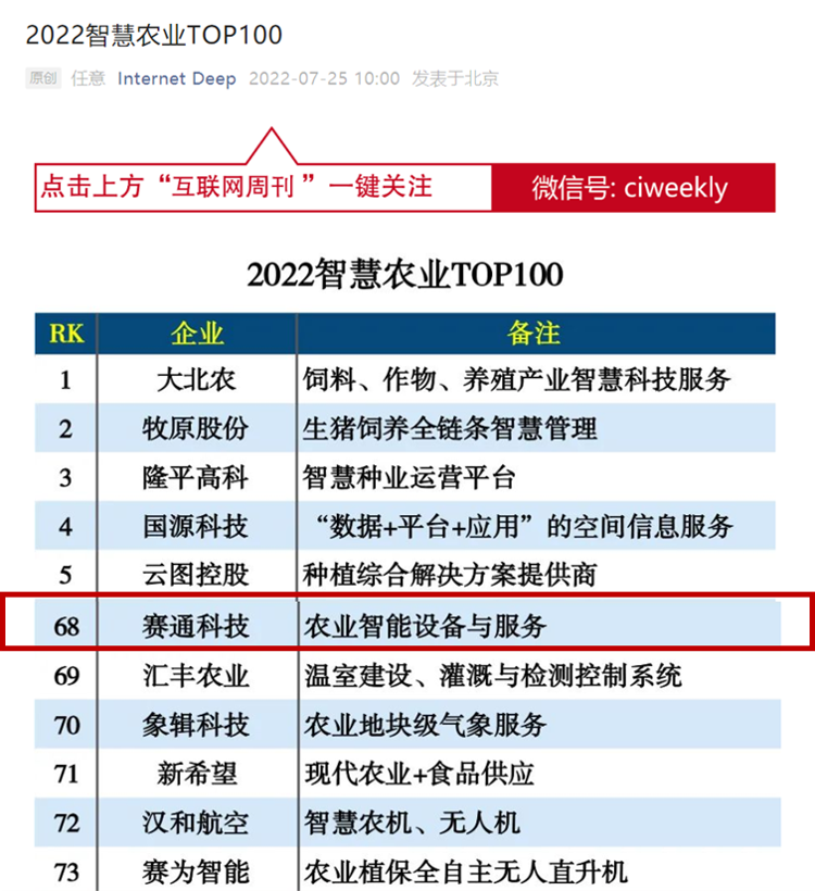 4、賽通科技獲評“2022智慧農業TOP100”