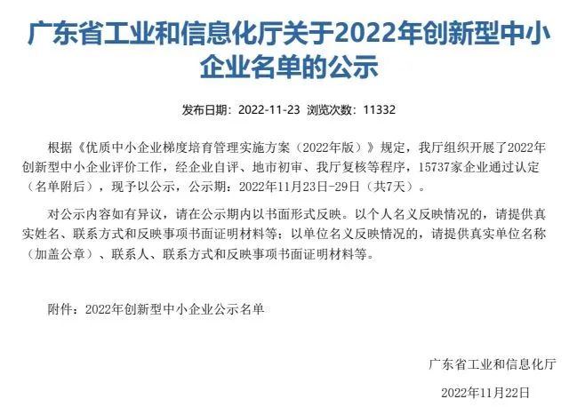 11月22日,廣東省2022年創新型中小企業名單公示,廣州市智慧農業服務股份有限公司與子公司廣州賽通科技有限公司、廣州米果智能設備有限公司以農業產業鏈數字化升級服務及智慧食堂全鏈解決方案的創新成果成功被認定為“廣東省創新型中小企業”。