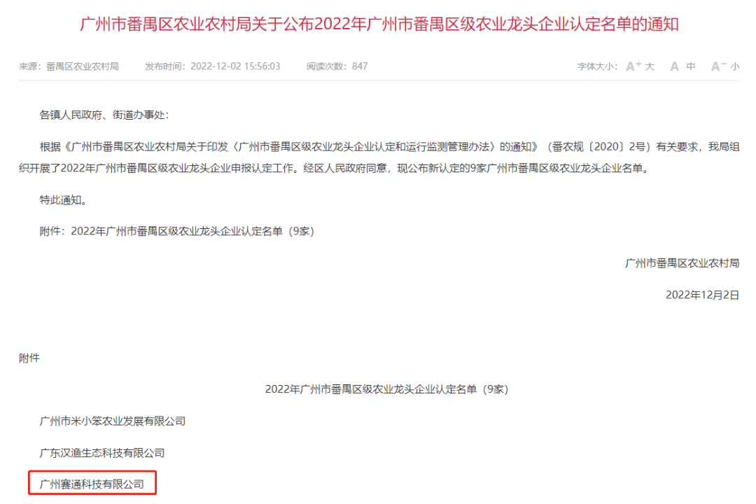 9、賽通科技獲番禺區級農業龍頭企業認定