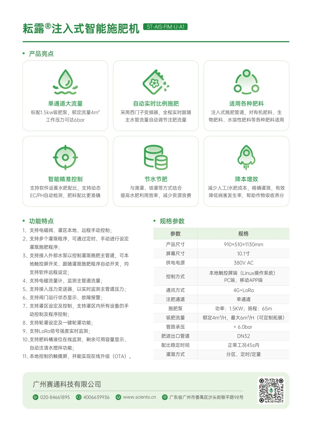 廣州賽通科技有限公司基于成熟的數字農業研發經驗和產品實踐經歷,以科技芯創新驅動水肥灌溉系列產品優化升級,自主研發大流量、強注肥能力、適用各種肥料的注入式智能施肥機;低功耗、長續航能力、通訊距離更遠的LoRa無線采集灌溉控制器……
