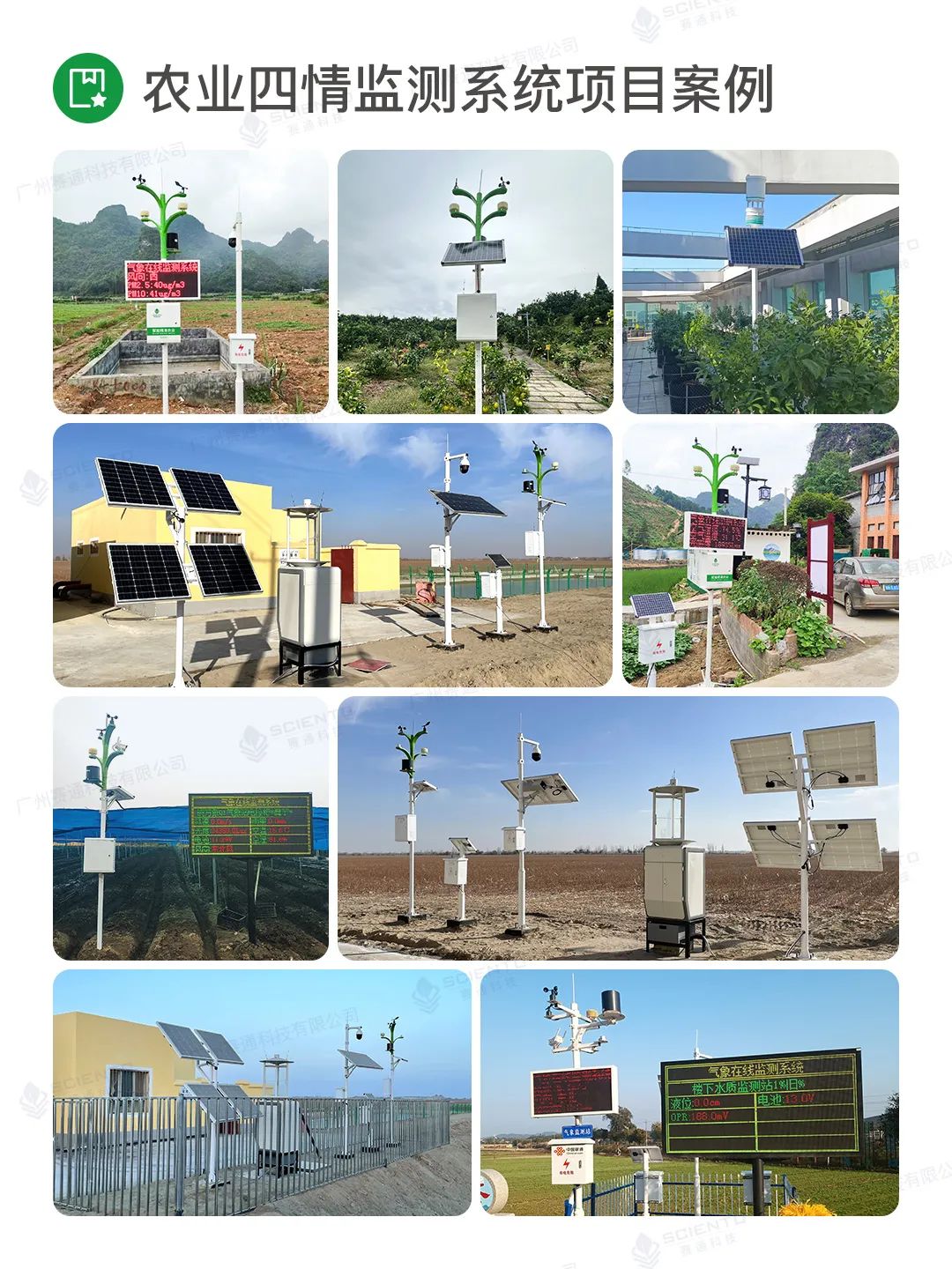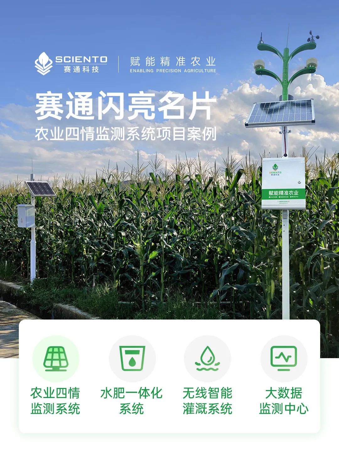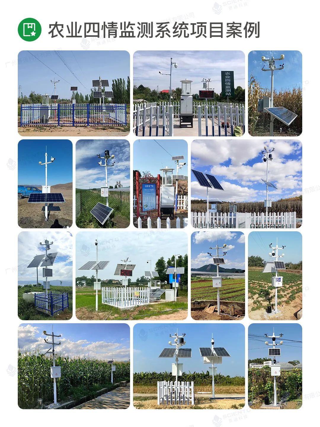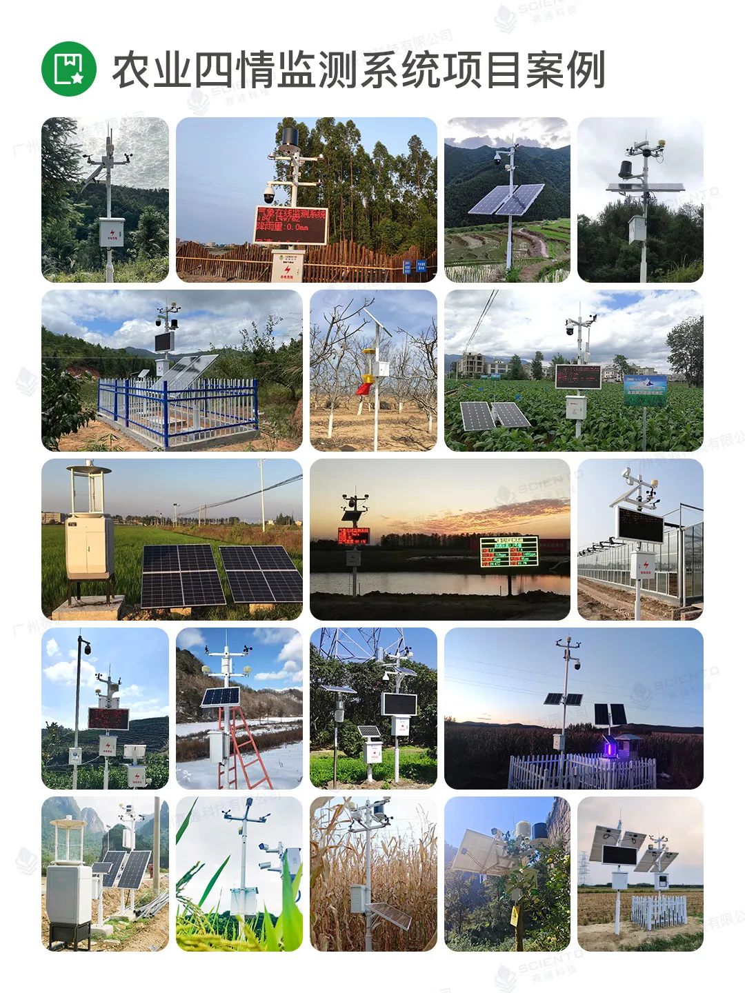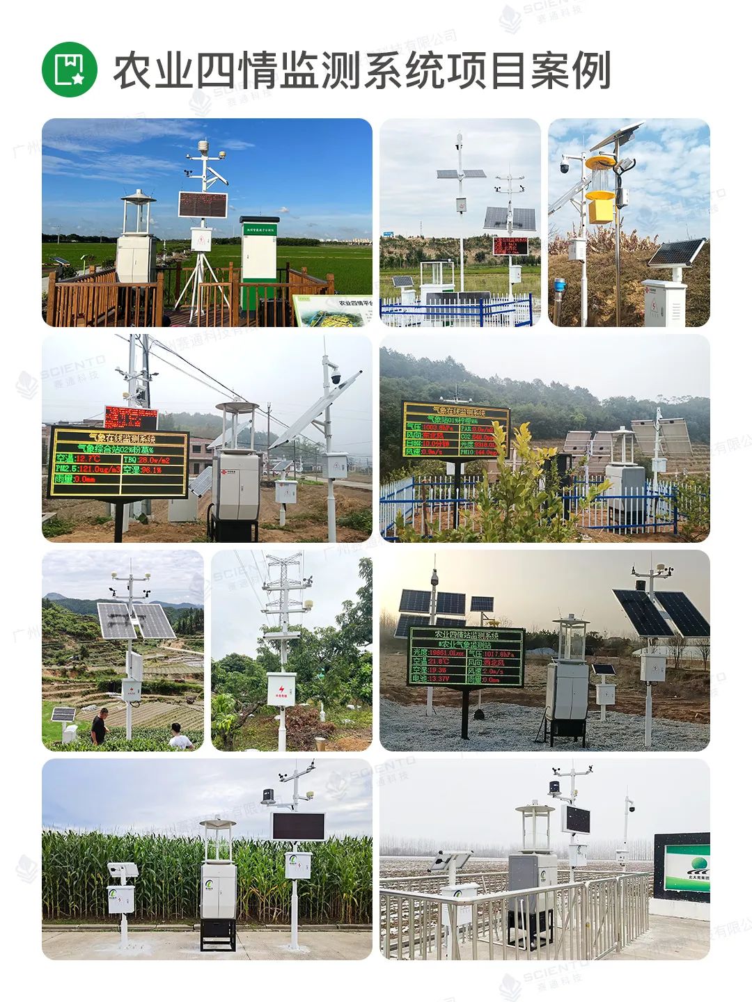 廣州賽通科技有限公司自主研發農業四情監測系統解決方案,搭配賽農耘®智慧農業管理平臺實現實時苗情、墑情、蟲情和災情監測感知,構建作物精準決策的數據支撐。