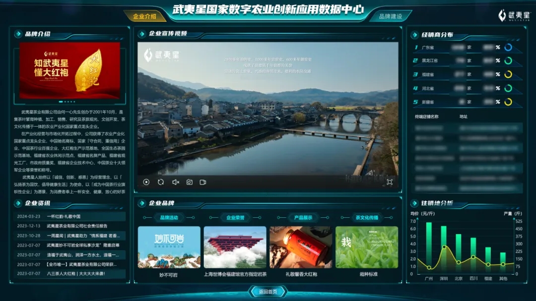 茶園可視化大數(shù)據(jù)平臺:集成企業(yè)宣傳一張圖、智慧茶園一張圖、數(shù)智營銷一張圖、綠色工廠一張圖、水肥一體化系統(tǒng)、質(zhì)量追溯檢測系統(tǒng)、數(shù)字農(nóng)業(yè)綜合系統(tǒng)、天地空一體化系統(tǒng)等創(chuàng)新應(yīng)用數(shù)據(jù),直觀形象地展示全場景數(shù)字茶產(chǎn)業(yè)平臺。
