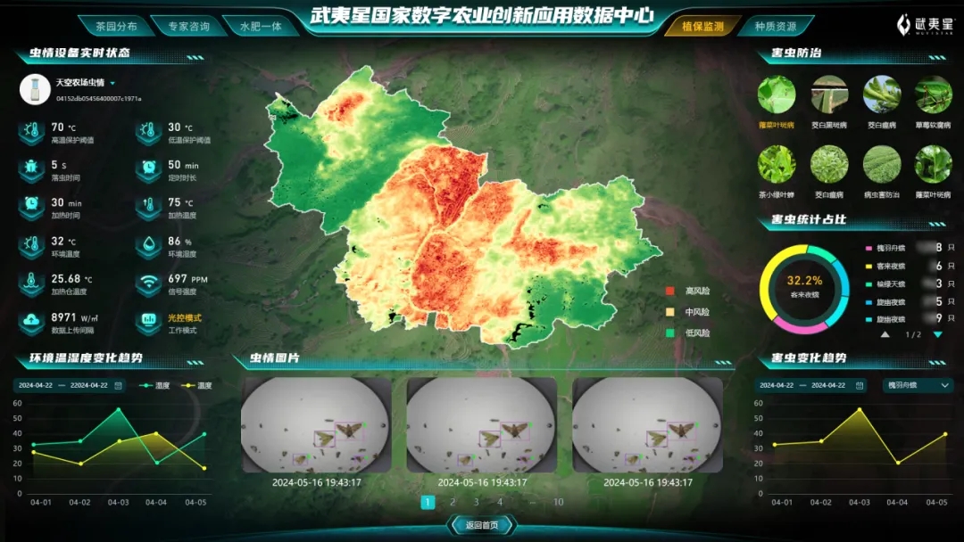 茶園綠色蟲控系統(tǒng):結(jié)合蟲情自動(dòng)識別測報(bào)燈、風(fēng)吸式太陽能殺蟲燈進(jìn)行茶園蟲害防控治理,利用茶尺蠖、茶角胸葉甲等主要害蟲的趨光、趨波、趨色、趨性特性原理,利用光源環(huán)保誘殺害蟲并收集蟲體樣本,實(shí)現(xiàn)害蟲誘集、分類統(tǒng)計(jì)、實(shí)時(shí)報(bào)傳、遠(yuǎn)程監(jiān)測、蟲害預(yù)警和綠色防治的自動(dòng)化、智能化。